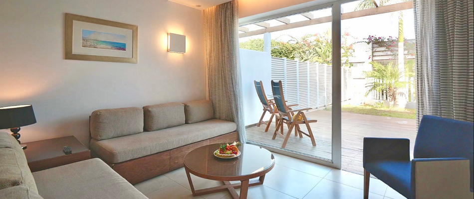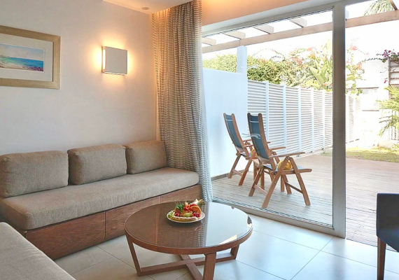 These rooms consist of a bedroom with a living area separated by a glass sliding door. Located on the ground floor they have a wooden terrace overlooking the garden.