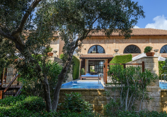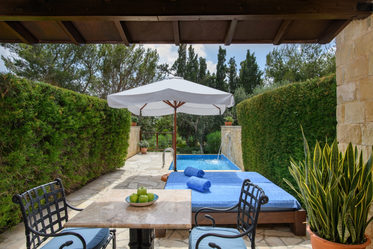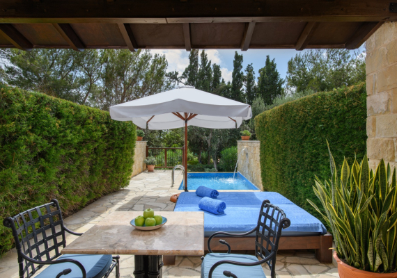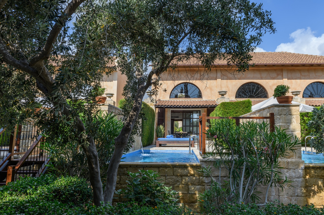 The villas are furnished with a large sofa bed and chic armchairs in the living area, while the mezzanine sleeping gallery is fitted with a separate shower room and a balcony that overlooks Elysium’s palatial grounds. Each villa has its own patio garden complete with plunge pool, and exclusive access to the dedicated adults-only swimming pool.