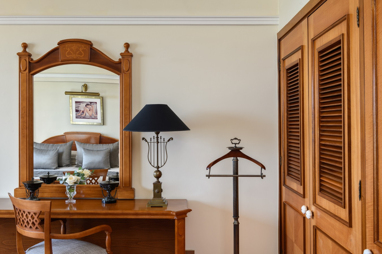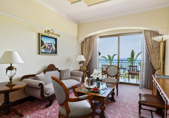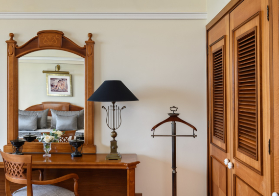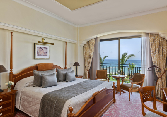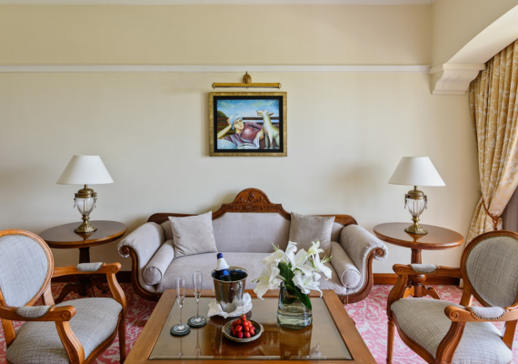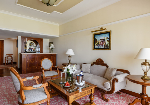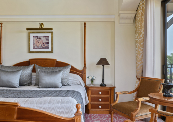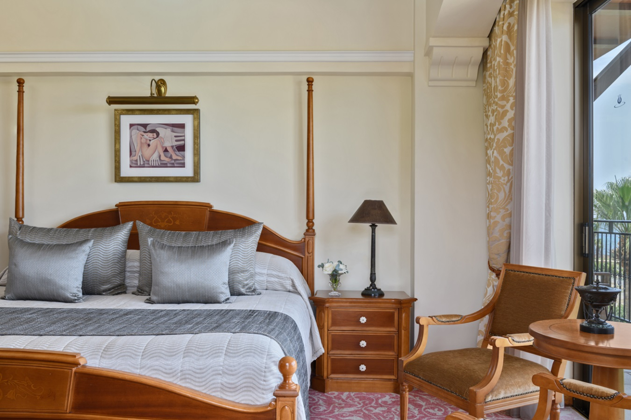 This comfortable and cozy space is enhanced by wooden furnishings, vintage candelabras, and classical Greek artwork. The living area features a sofa suite, coffee table and private bar, while the separate bedroom area encompasses an inviting four-poster bed and soft lighting. En-suite bathroom offers a bathtub and Jacuzzi, and separate walk-in shower. The Suite’s balcony offers views of the Mediterranean Sea and the Elysium’s lush, landscaped gardens.