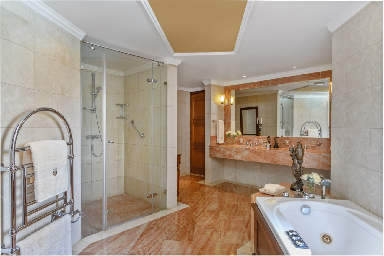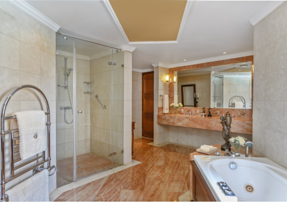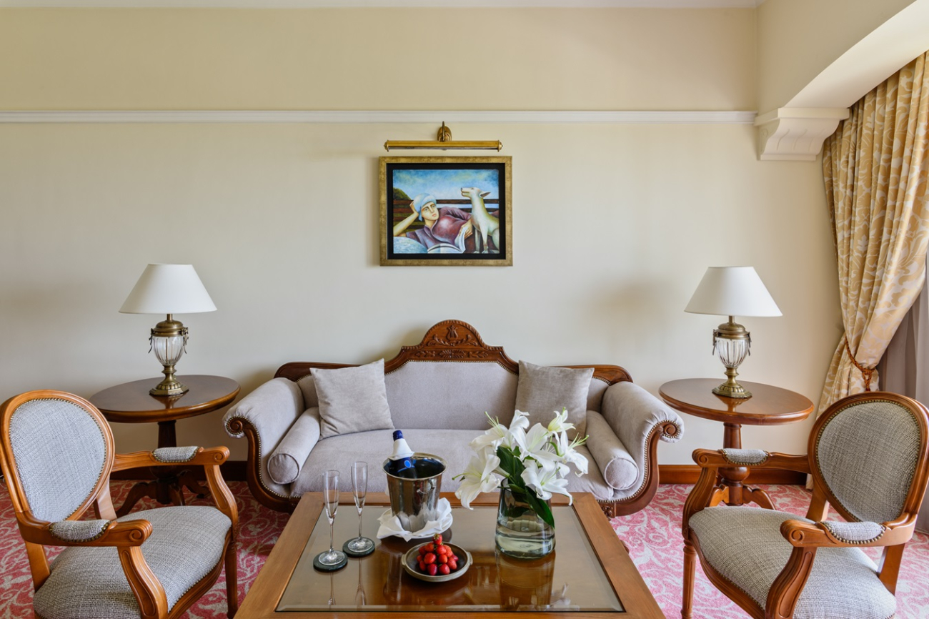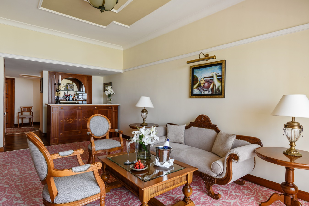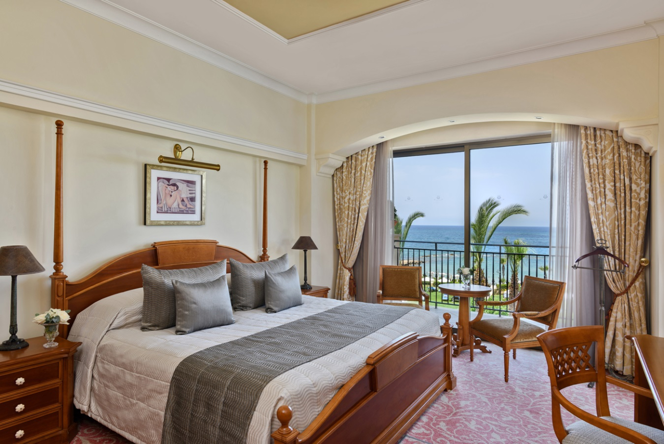 This comfortable and cozy space is enhanced by wooden furnishings, vintage candelabras, and classical Greek artwork. The living area features a sofa suite, coffee table and private bar, while the separate bedroom area encompasses an inviting four-poster bed and soft lighting. En-suite bathroom offers a bathtub and Jacuzzi, and separate walk-in shower. The Suite’s balcony offers views of the Mediterranean Sea and the Elysium’s lush, landscaped gardens.