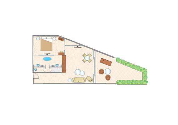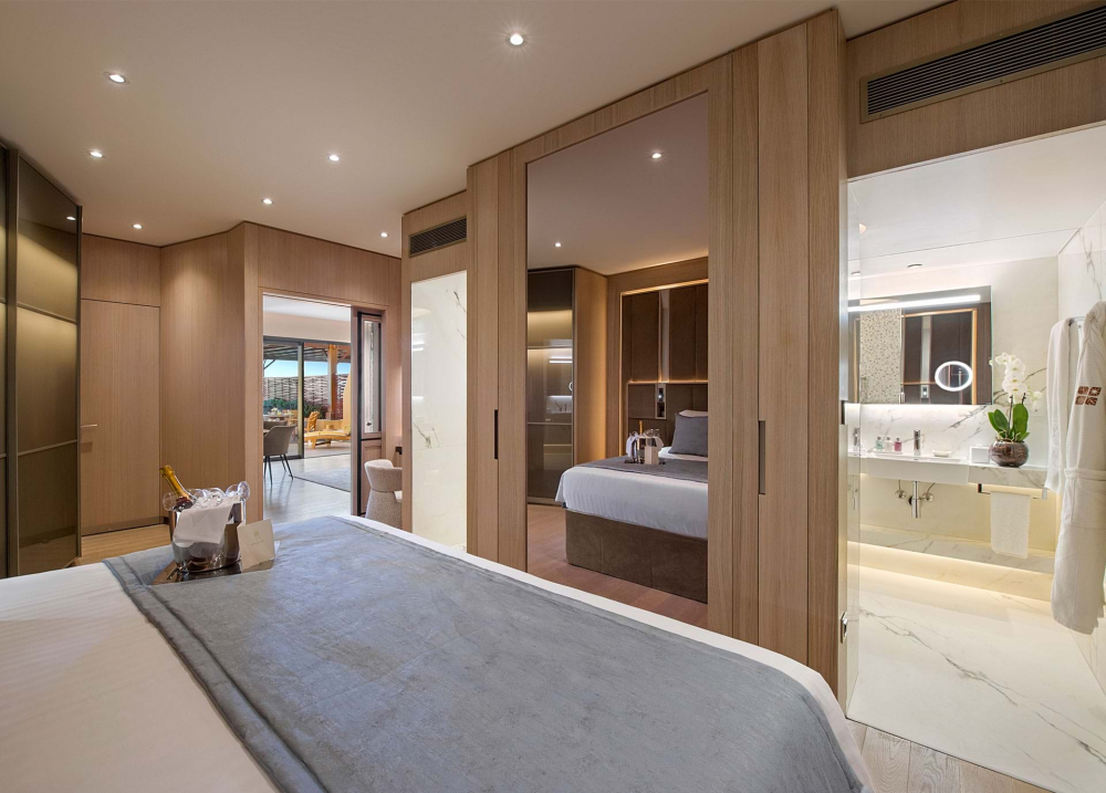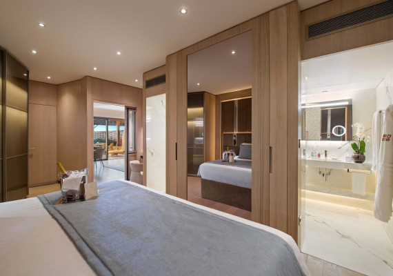 Room located in the main building on the 3rd floor, in the west wing. It consists of a bedroom and a living room with dining area for 4 people. The bathroom is equipped with a jacuzzi. Three furnished balconies with sea view. Guests of these rooms additionally receive: fruit daily, a bottle of imported sparkling wine upon arrival, complimentary pre-dinner drinks and canapés daily.