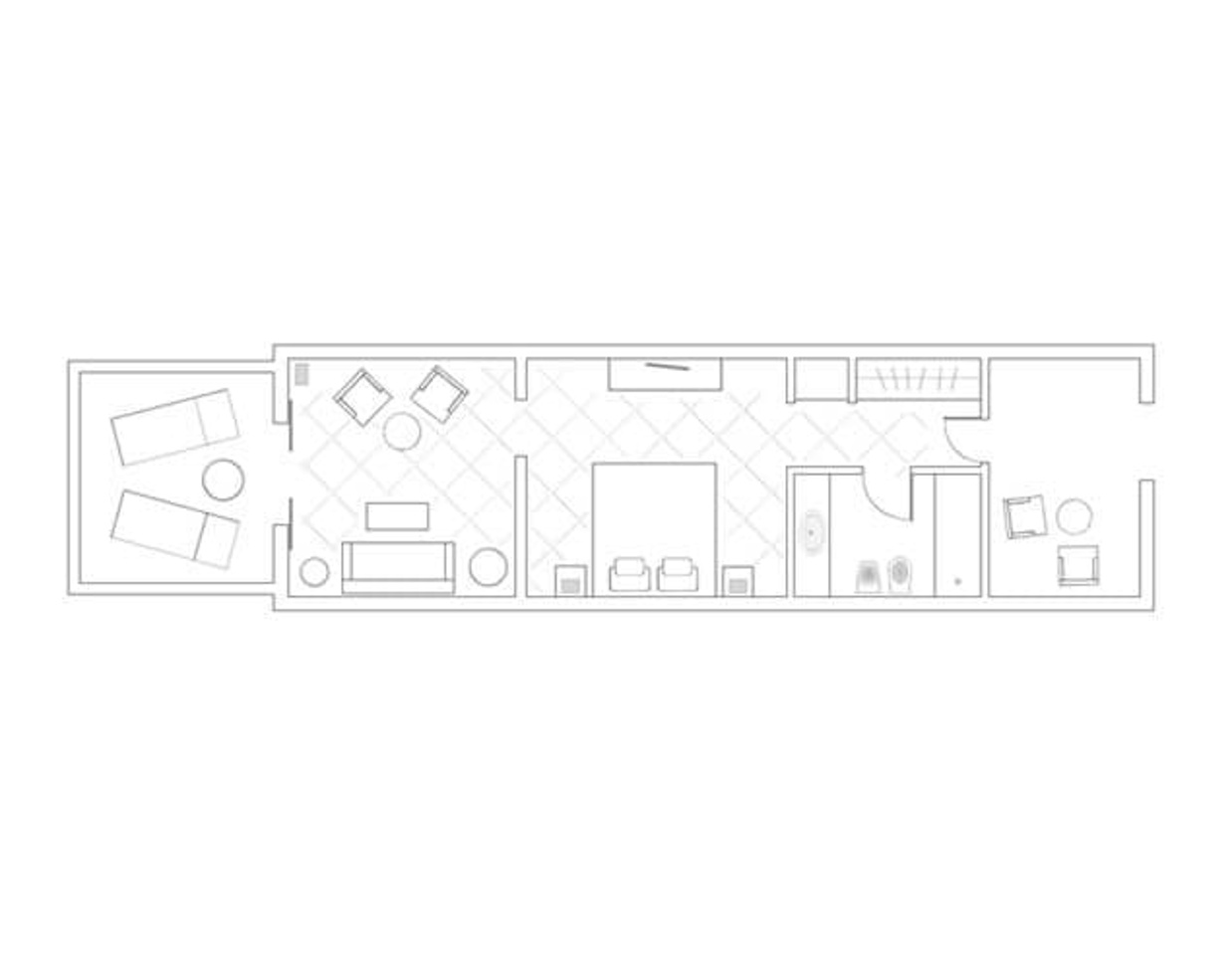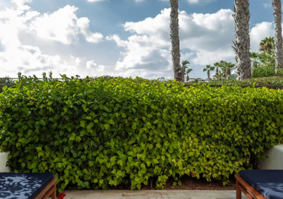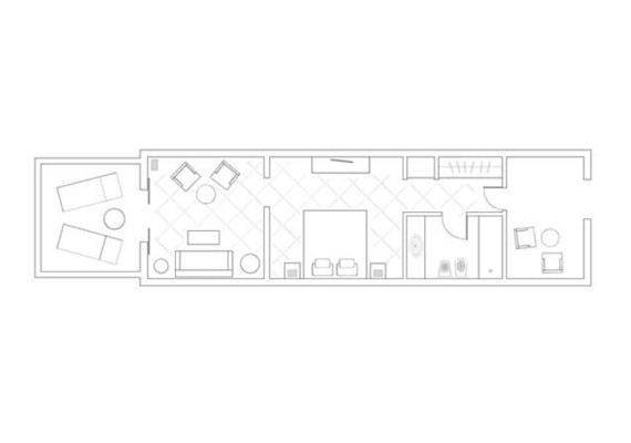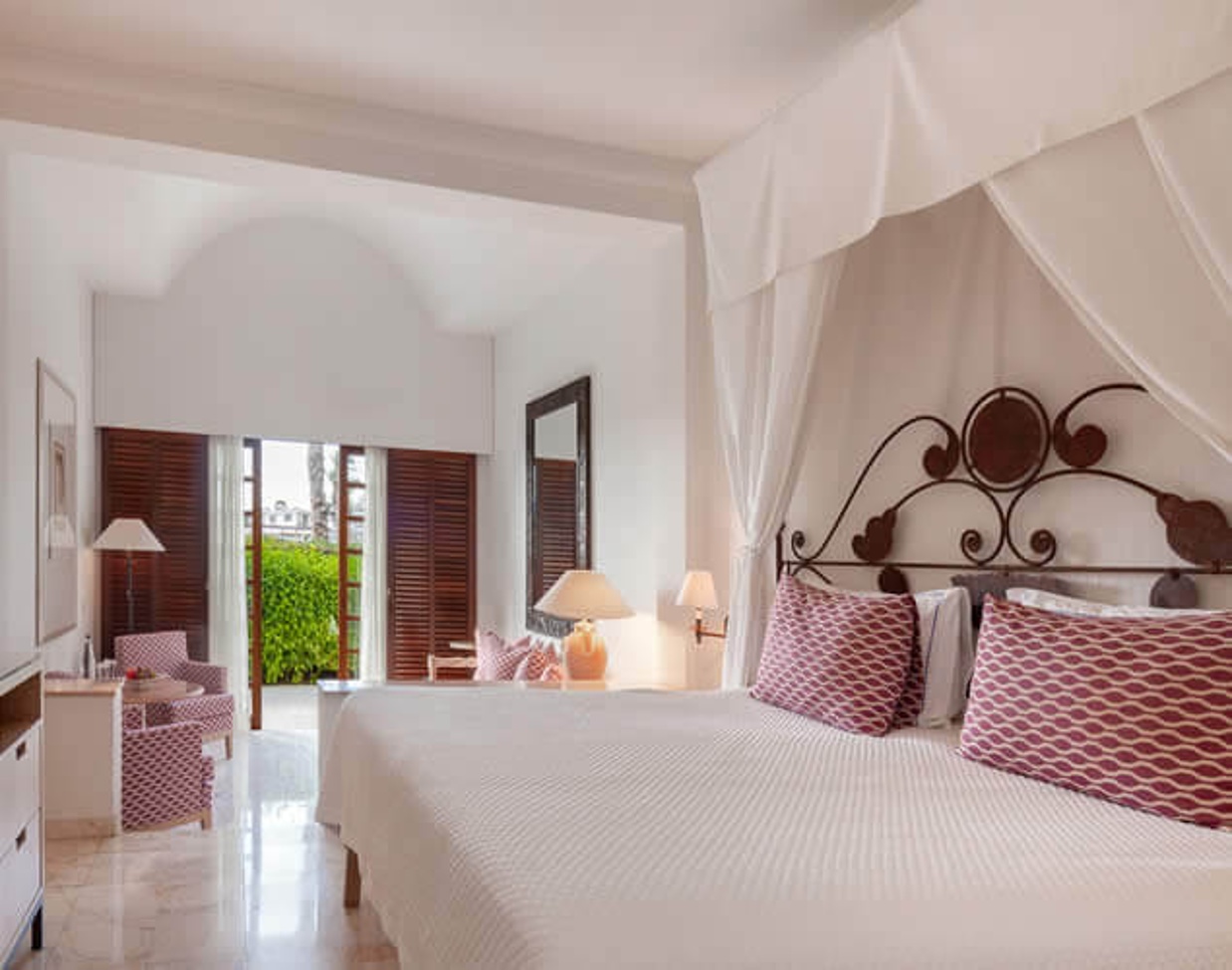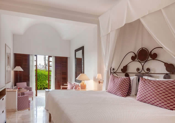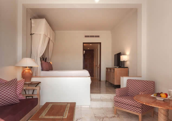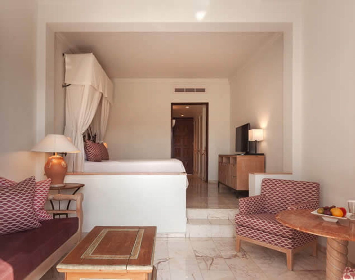 Однокомнатные сьюты в греческом стиле состоят из спальни и зоны гостиной. С террасы площадью 10м2 открывается вид на зеленый сад. Здесь же установлены шезлонги.