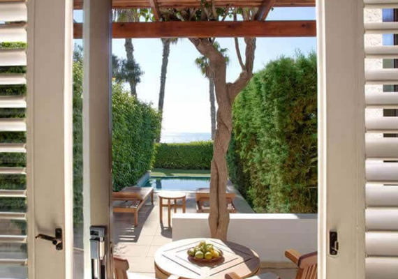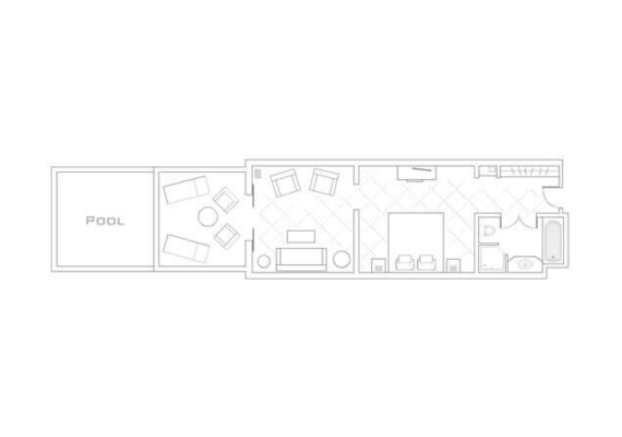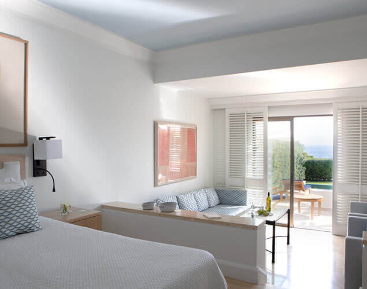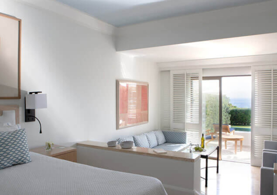 Эти просторные сьюты состоят из спальни и зоны гостиной, а также располагают большими террасами с собственными бассейнами. На террасах установлены шезлонги.