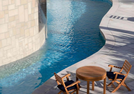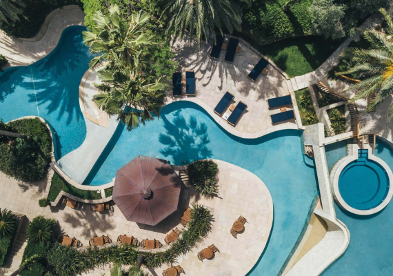 3 открытых бассейна с пресной водой и каскадными водопадами и гротом, в который можно заплыть.